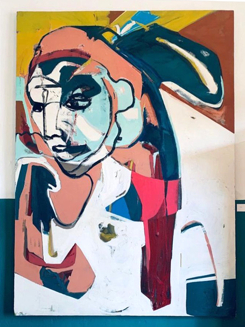 This work is based on the „b-present“ installation from 2003, which transformed a historical space from Wim Wenders‘ film „The American Friend“ (1977) into a painted club scene. In 2018, Tina Oelker reworked the central painting „The Queue“ to create „Athene“. The painting combines elements of the original club scene with symbolism of the Greek goddess of wisdom and warfare.