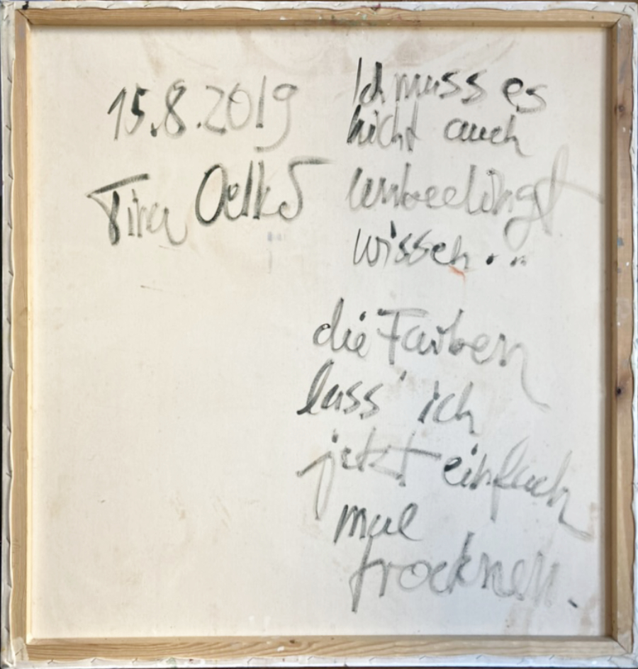 „At The Table N° 6“ was created in 2006 as part of a diptych with „At The Table N° 7″. Initially planned as a unit in 2010, the works were later separated. N° 6 was incorporated into the „25 Colours Stockholm“ programme, while N° 7 (also overpainted) remained in the archive with the hunting paintings. Tina Oelker completed the painting in 2020 and retained the original title – linking different creative periods.